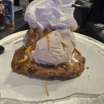 Salted Chocolate Chip Cookie. Eat it warmed up by itself or top it with Dirty Dawg’s ice cream, drizzle and whipped cream on top. Made in house.